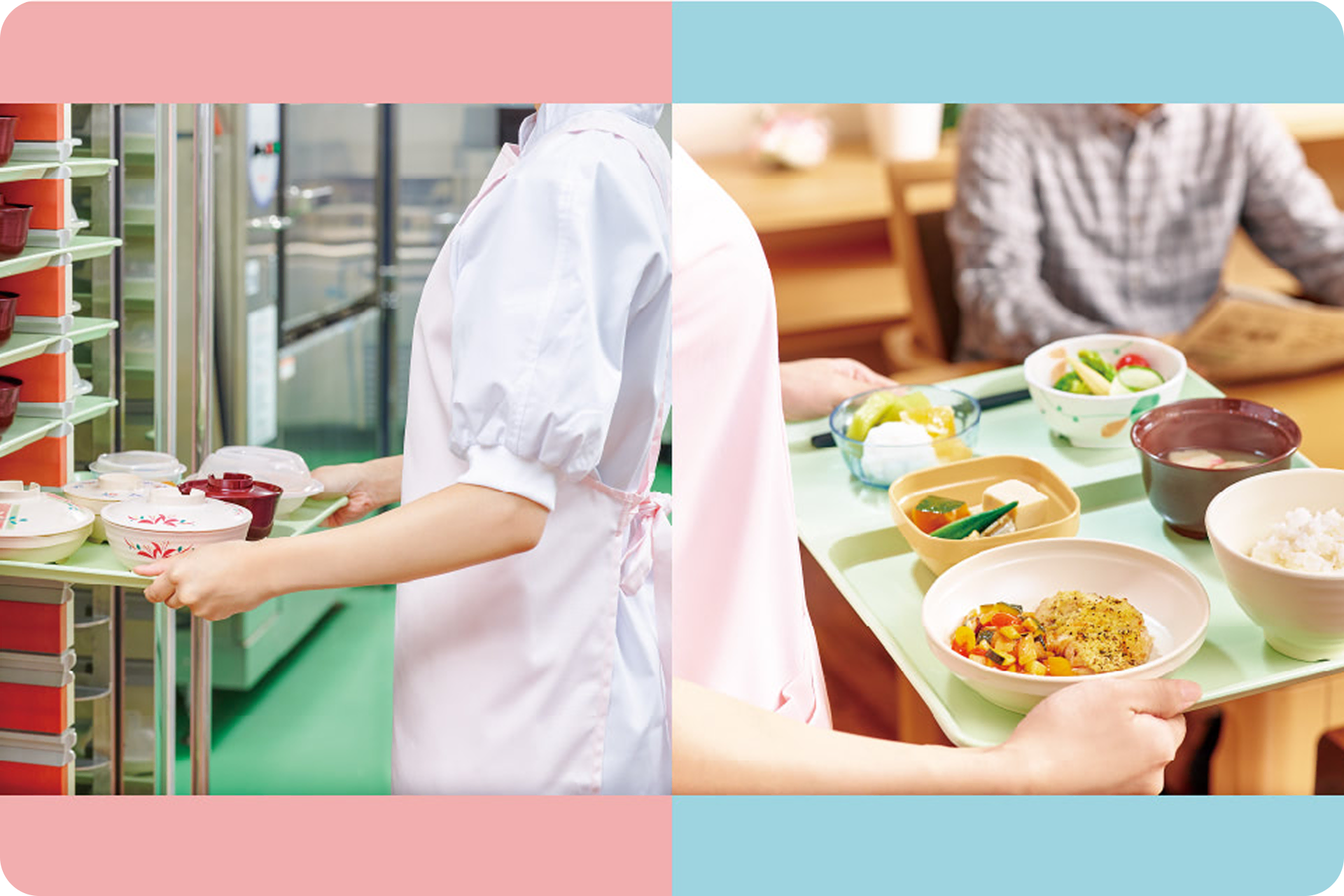 チルドで納品された食材を盛り付けして、専用の加熱カートにインするだけで、できたて熱々の美味しい食事が提供できます。加熱カートで温蔵できるため、いつでも温かい食事を食べることができます。