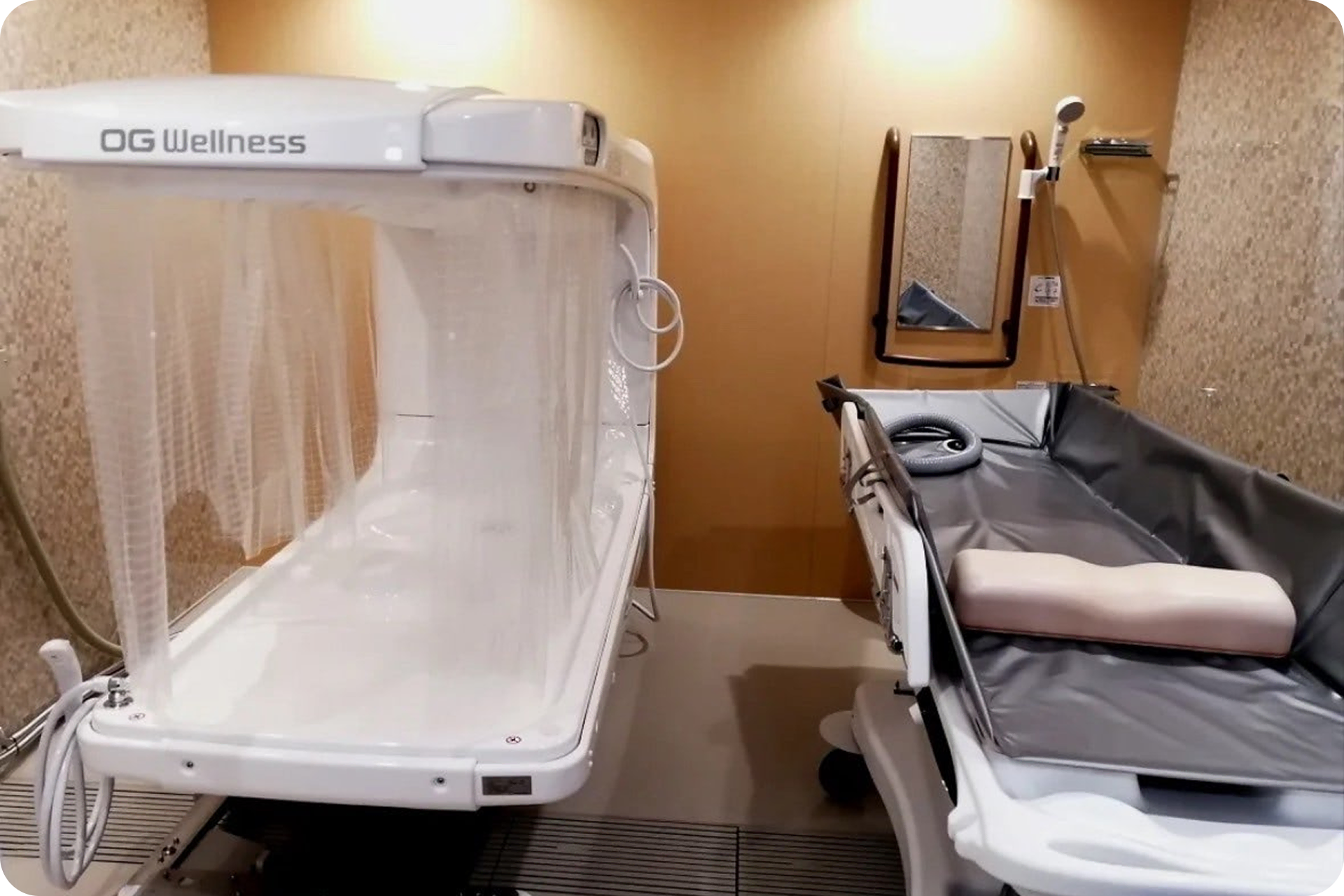 ミスト浴は一般的な湯浴よりも温浴効果が高く、特に高齢者の入浴による身体的負担や疲労軽減にもつながります。また洗身もミストで行うため皮膚にも優しいメリットがあります。